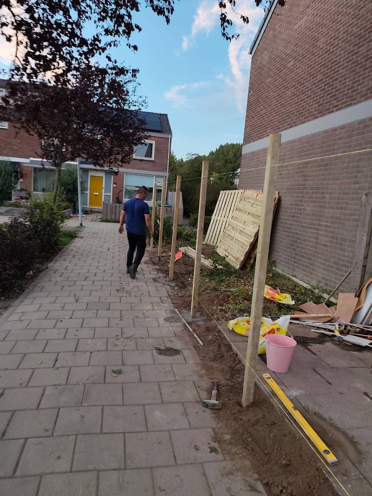 De palen worden stevig geplaatst, vaak met beton, zodat de schutting stabiel en duurzaam blijft.